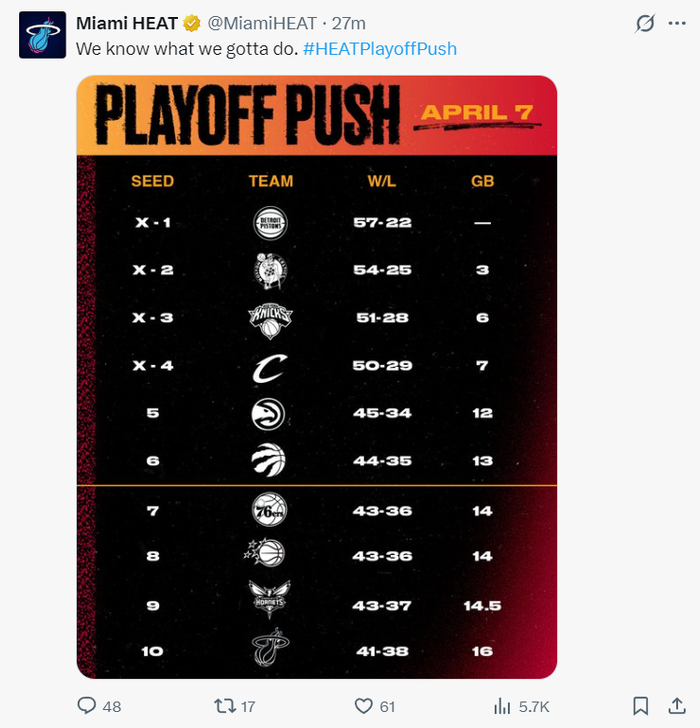 2025年热火先击败公牛再度击败老鹰,成为历史第一支以东部第十最终以东部第七进入季后赛的球队,只可惜首轮0-4不敌骑士。